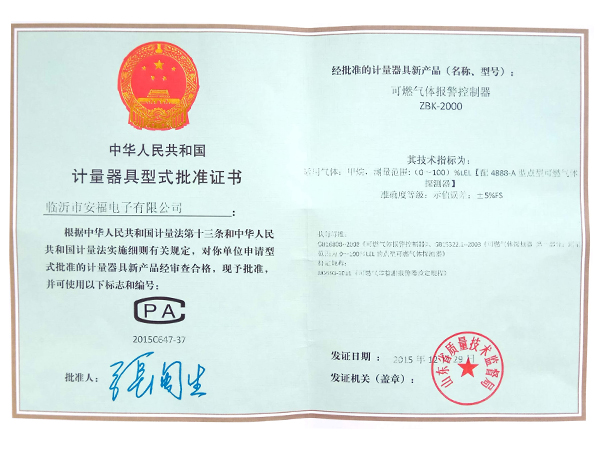 计量器具型式批准证书ZBK-2000(可燃、甲烷)