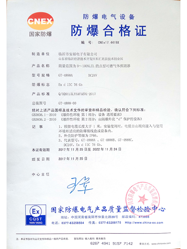 防爆合格证(GT-4888A点型可燃气体探测器)